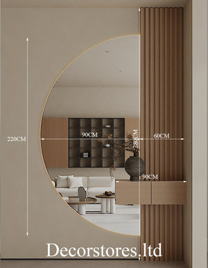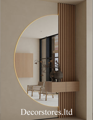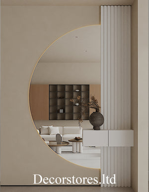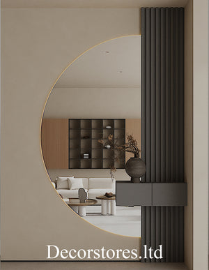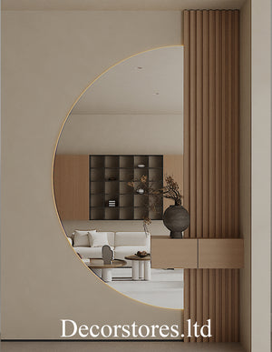 A circular mirror integrated with a wooden shelf featuring a modern and simple design, perfect for adding a stylish and practical touch to any interior space.