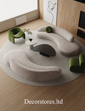 جلسة المها تتميز بتصميمها الفريد المستوحى من الطبيعة، حيث تلتقي الخطوط المنحنية لتشكل مساحة تجمع بين الراحة والفخامة. تضفي الأريكة الكبيرة المنحنية طابعاً فريداً على أي غرفة معيشة، مع توفير مساحة واسعة للاسترخاء والتجمعات العائلية. تتكامل الجلسة مع كراسي جانبية بتصميم أنيق وألوان زاهية، تضيف لمسة عصرية مرحة للتصميم.